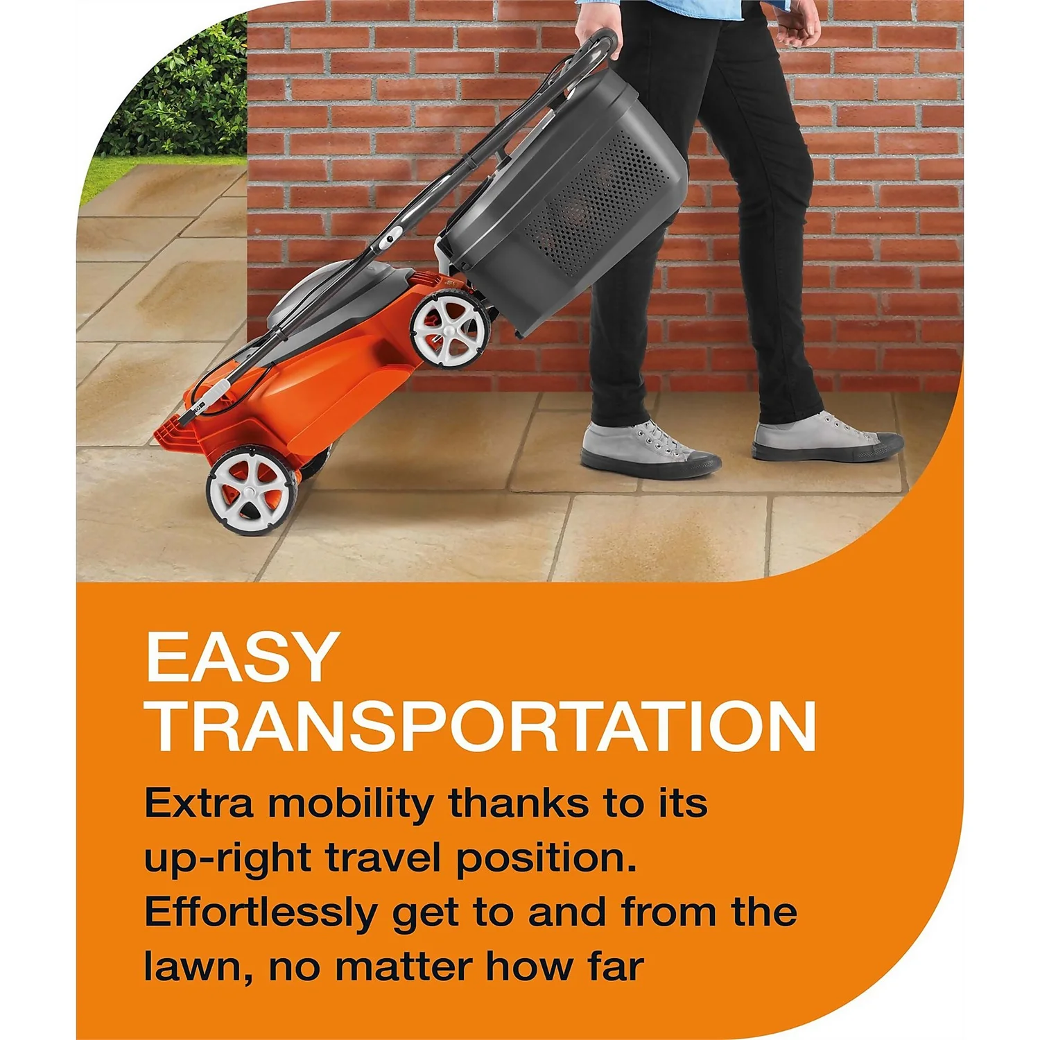 Designed for small to medium gardens, the Flymo easistore 340 li is a 34cm battery powered rotary lawnmower which uses 2 removable c-link lithium Ion batteries. Features space saving storage and unique transport position. Also equipped with a large easy to empty 35l grass box, central height adjust, close-to-edge cutting deck, a rear roller to create a striped effect, and comfortable dual lever handles.